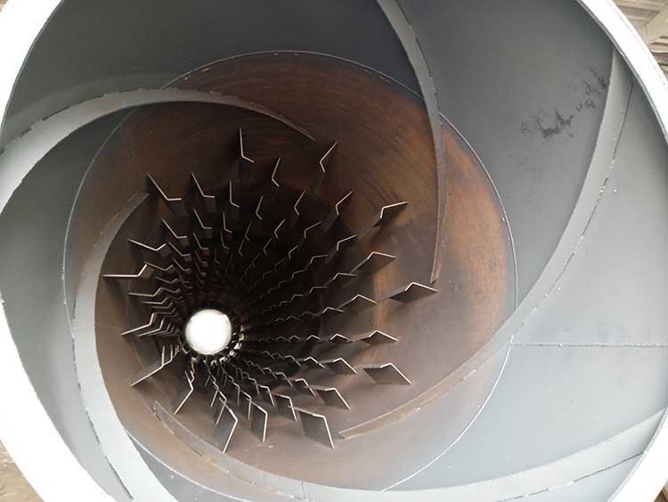 干燥的濕物料由皮帶輸送機或斗式提升機送到料斗,然后經料斗的加料機通過加料管道進入加料端。加料管道的斜度要大于物料的自然傾角,以便物料順利流入干燥器內。干燥器圓筒是一個與水平線略成傾斜的旋轉圓筒。物料從較高一端加入,載熱體由低端進入,與物料成逆流接觸,也有載熱體和物料一起并流進入筒體的。隨著圓筒的轉動物料受重力作用運行到較底的一端。濕物料在筒體內向前移動過程中,直接或間接得到了載熱體的給熱,使?jié)裎锪系靡愿稍铮缓笤诔隽隙私浧C或螺旋輸送機送出。在筒體內壁上裝有抄板,它的作用是把物料抄起來又撒下,使物料與氣流的接觸表面增大,以提高干燥速率并促進物料前進。載熱體一般分為熱空氣、煙道氣等。載熱體經干燥器以后,一般需要旋風除塵器將氣體內所帶物料捕集下來。如需進一步減少尾氣含塵量,還應經過袋式除塵器或濕法除塵器后再放排放。